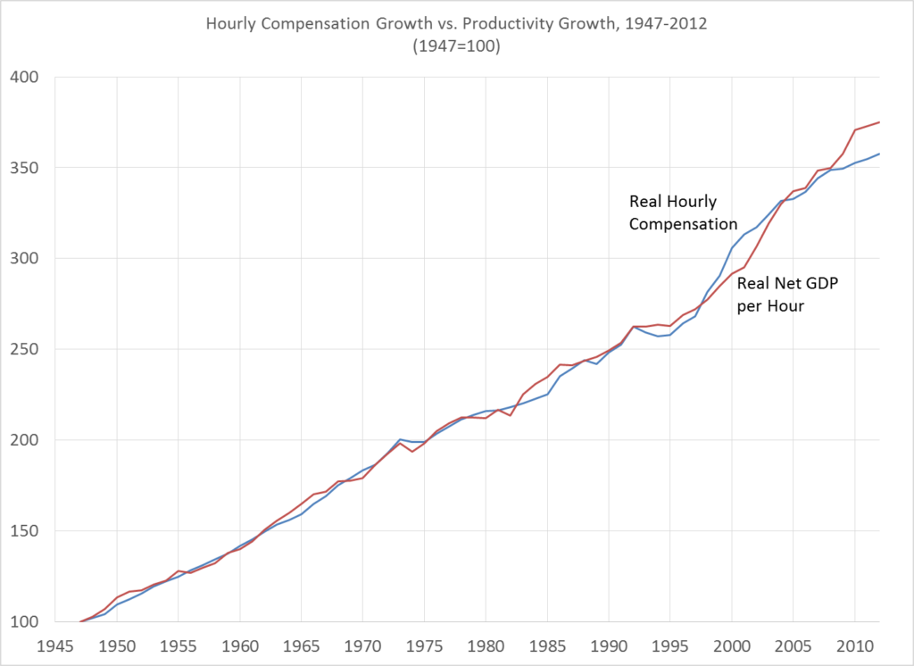 According to Scott Winship, “the charts used to demonstrate the supposed breakdown of this relationship obscure the reality that productivity and hourly compensation continue to track each other”. The main problem is that the chart shows family income rather than hourly pay (or, better still, hourly compensation). This chart shows a more like-for-like comparison: